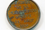 RELIGION PROTESTANTE - " 3e JUBILE de la REFORMATION GENEVE 23 août 1835", médaille commémorative - à l'avers sur fond de rayons partants de " IHS - LA SAINTE BIBLE " ouverte avec légende en pourtour "POST TENEBRAS LUX" (la lumière après l'obscurité - Cuivre 33 mm - 17,94 grammes - TB