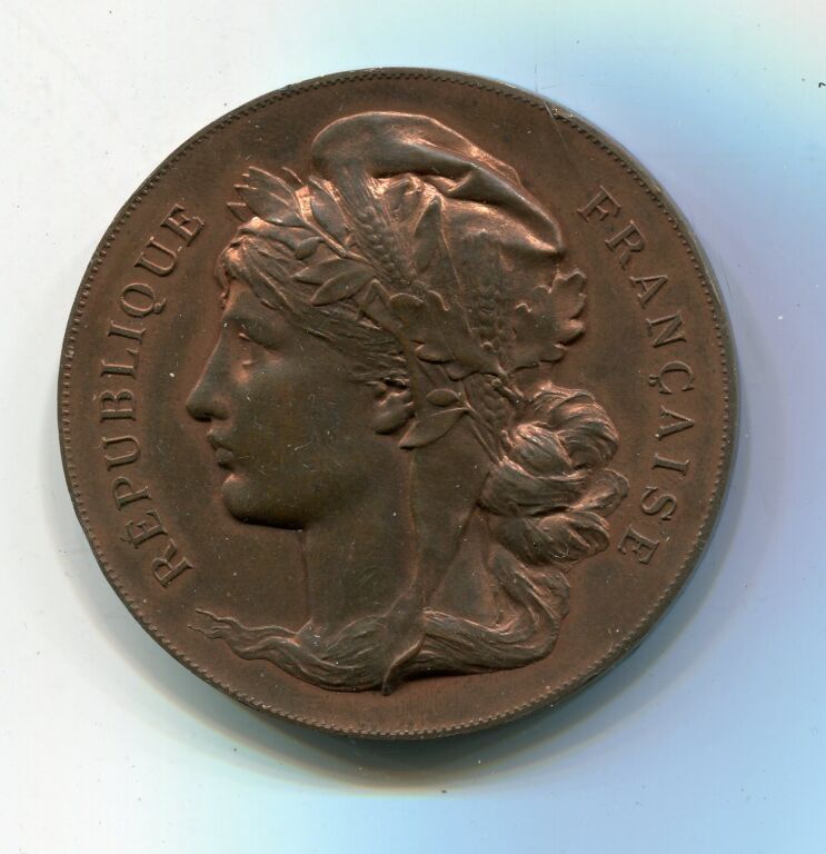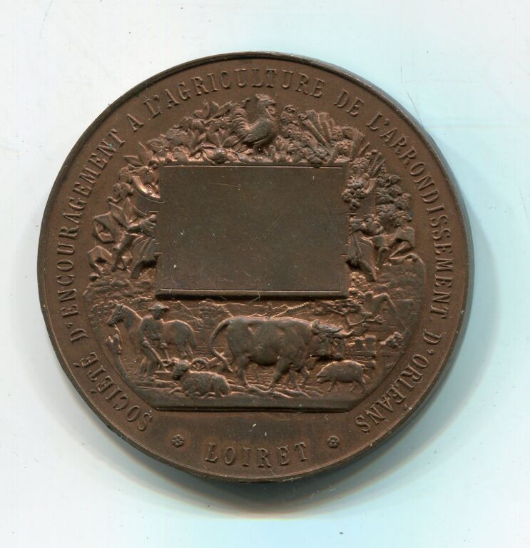 " SOCIETE D'ENCOURAGEMENT à L'AGRICULTURE de L'ARRONDISSEMENT D'ORLEANS / LOIRET " - République Française, tête coiffée du bonnet phrygien, laurée de laurier et d'épi de blé, profil à gauche - Revers : en centre cartouche pour attribution surmonté d'un coq et feuillage ; au-dessous ferme avec scène de labour, vache, mouton, cochon. Poinçon argent sur la tranche - grand module 50 mm en BRONZE patiné rouge.