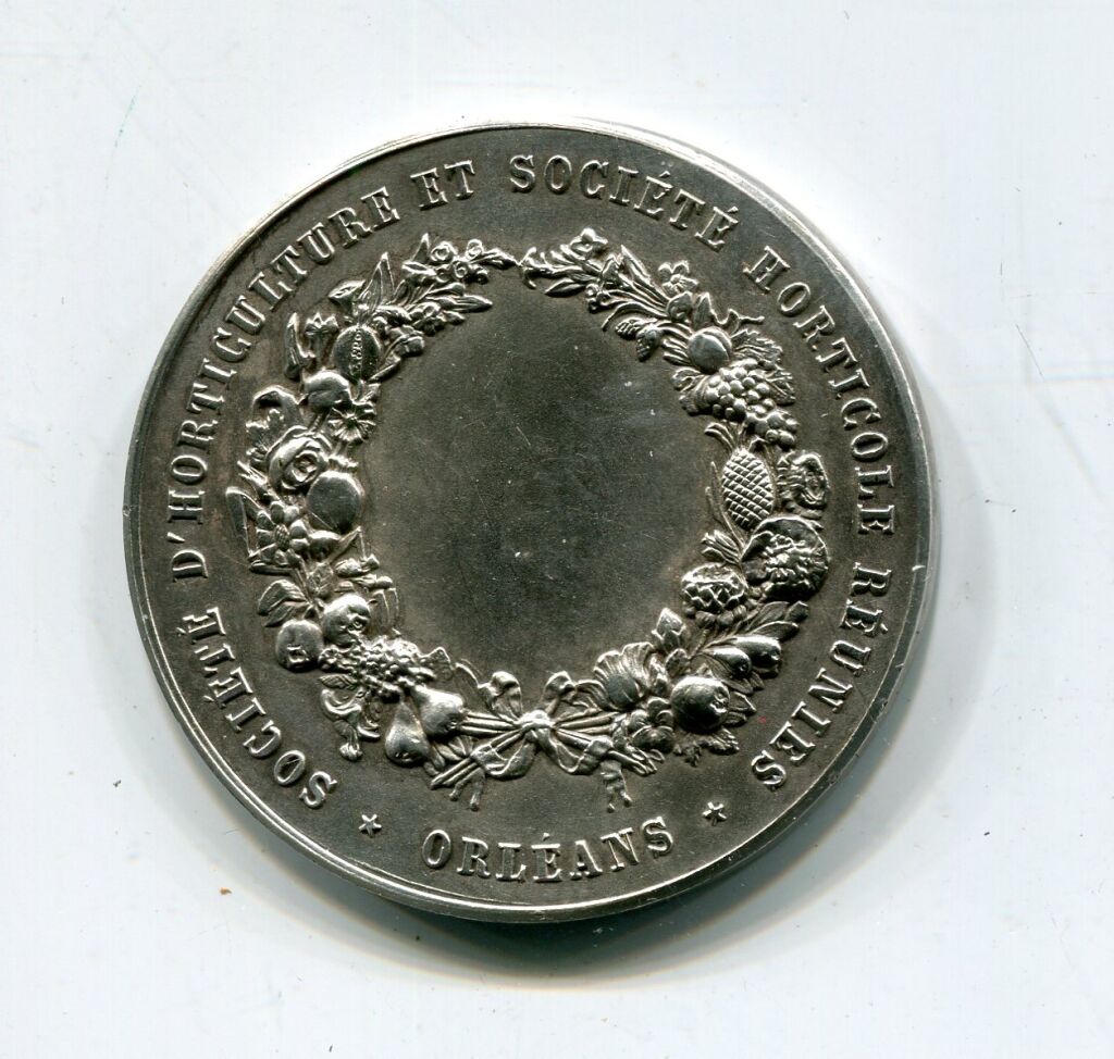 " SOCIETE D'HORTICULTURE ET SOCIETE HORTICOLE REUNIES -ORLEANS ", petite médaille classe argent bronze argenté, couronne de fruits, fleurs et céréales, centre pour attribution.- Avers : femme assise sur un banc faisant un bouquet, à sa droite en 2e plan 2 jardiniers à l'ouvrage devant des serres - 38 mm - 22 grammes - L/A n° 748 - TTB