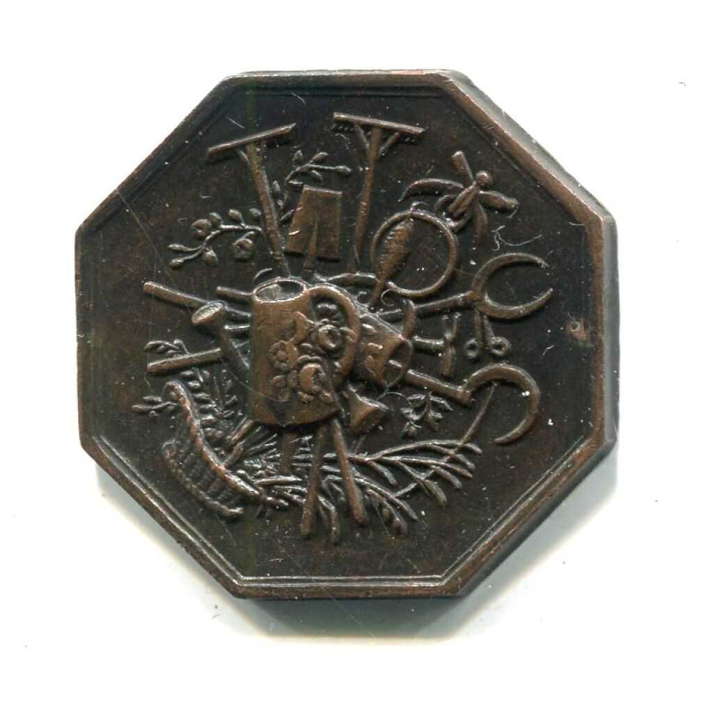 Instruments de jardinage en faisceau, suspendu au centre un panier tressé rempli de graminées, abeille, broc en centre - Titre au revers - jeton octogonal cuivre 25 mm - sans poinçon. - 5,90 grammes - L/A n° 705 - SUP