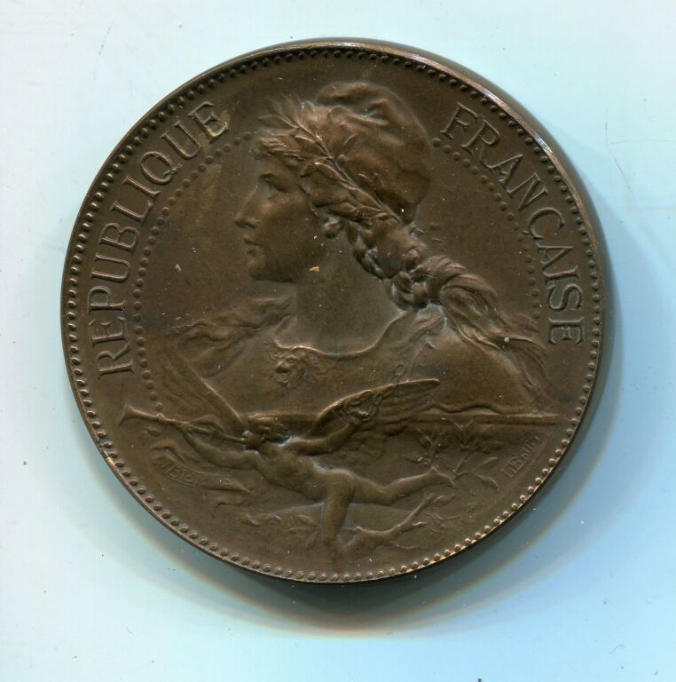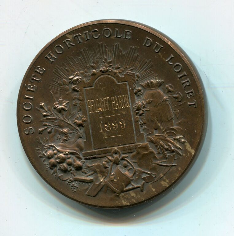 " République Française ", tête laurée coiffée du bonnet phrygien, longs cheveux et palme sur le front ; dessous génie ailé, courant et sonnant de la trompe ; en dessous banderole LIBERTE - OEuvre signée L. BOTTEE - Revers : titre et décor d'une ruche, fleurs & fruits, arrosoirs & outils de jardinage - Attribution en centre : BELOUET BARON 1899.