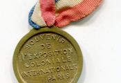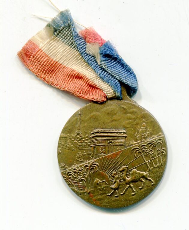 Médaillette de promotion représentation pour moitié de Paris avec sa Tour Eiffel, Arc de Triomphe, Basilique Montmartre, pour l'autre moitié : désert de l'Afrique avec palmiers et dromadaires. Cuivre 25,5 mm avec bélière et son petit ruban tricolore aux couleurs du drapeau national. TTB