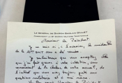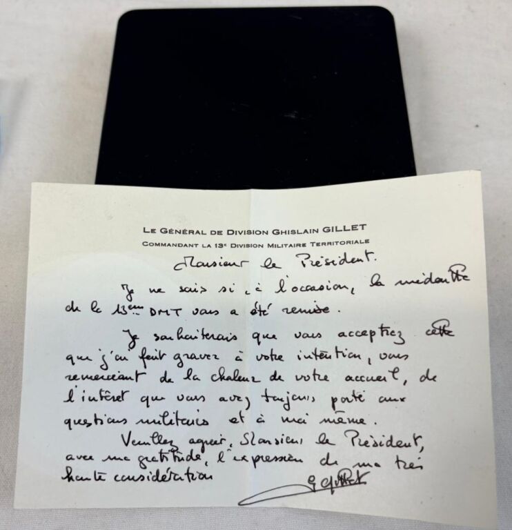 "...je ne sais pas si la médaille de la 13e DMT vous a été remise. Je souhaiterais que vous acceptiez celle que j'ai fait graver à votre intention, vous remerciant de la chaleur de votre accueil, de l'intérêt que vous avez toujours porté aux questions militaires ...etc.