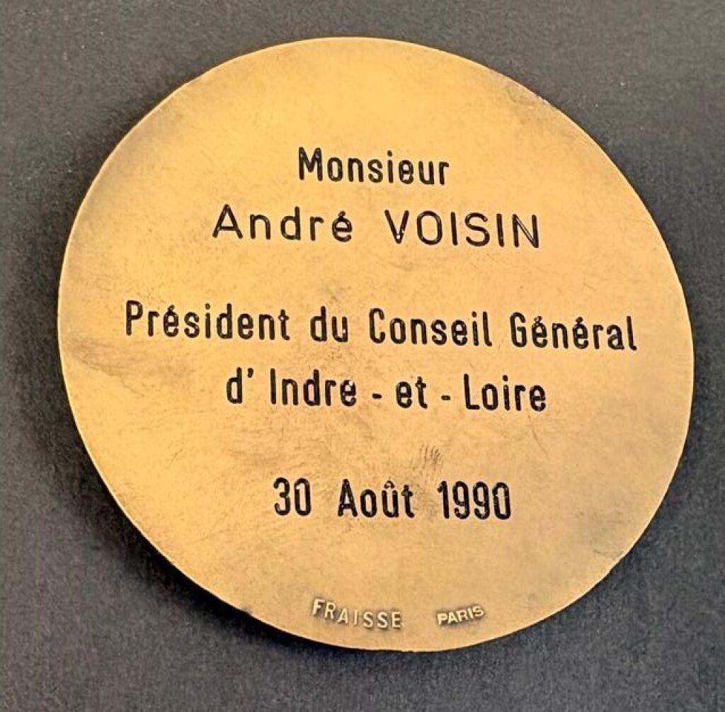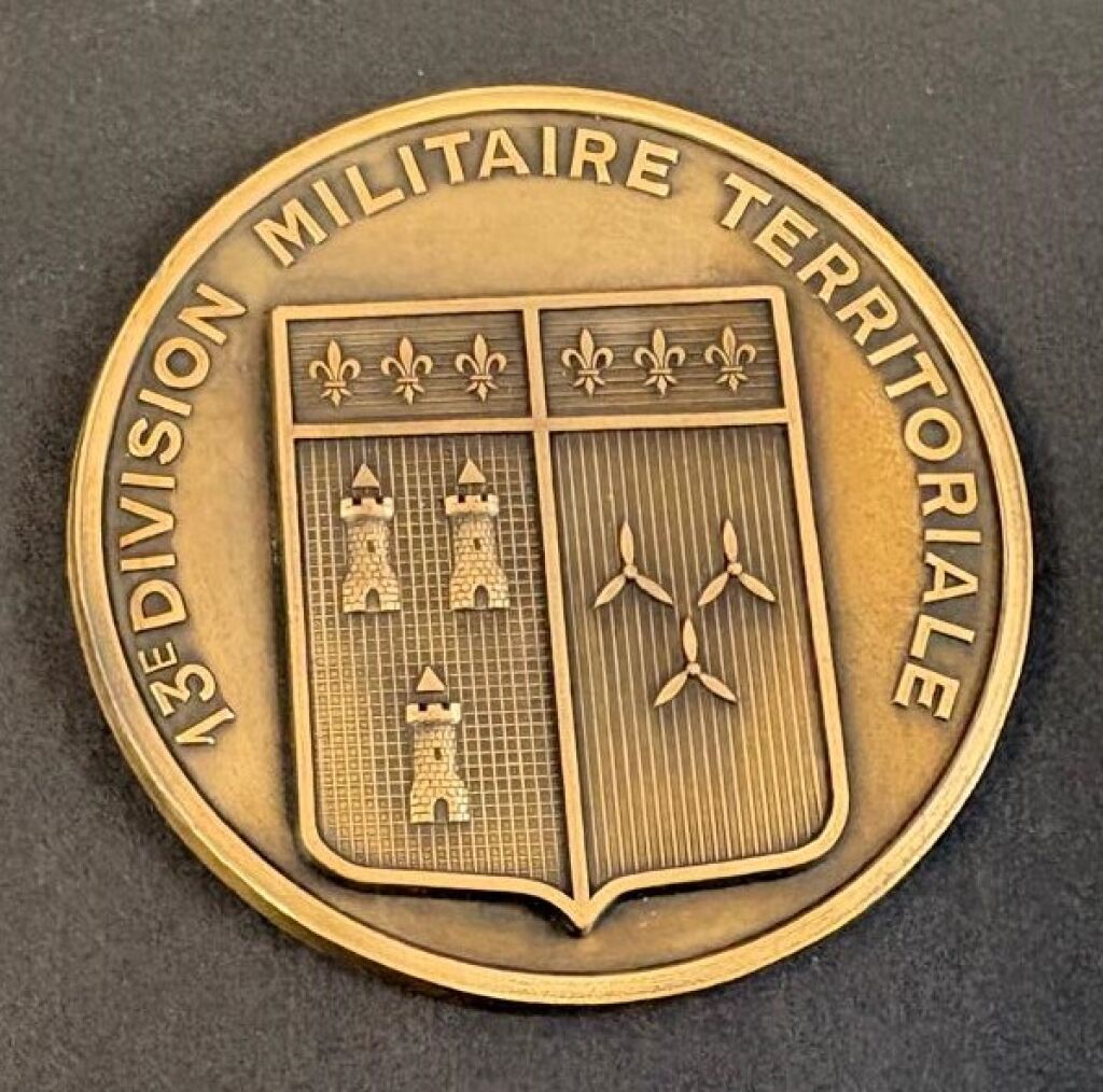 Titre et en centre blason de la Division, pour moitié blason de Tours, pour moitié blason d'Orléans - Attribution spéciale au revers : "Mr André Voisin, Président du Conseil Général d'Indre & Loire 30 août 1990" - 74 mm bronze patiné vieux bronze, fabrication FRAISSE.