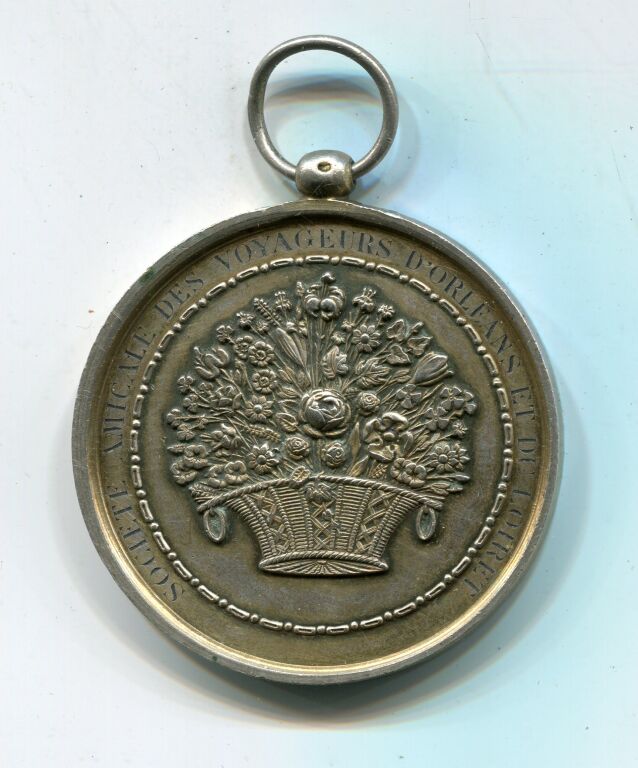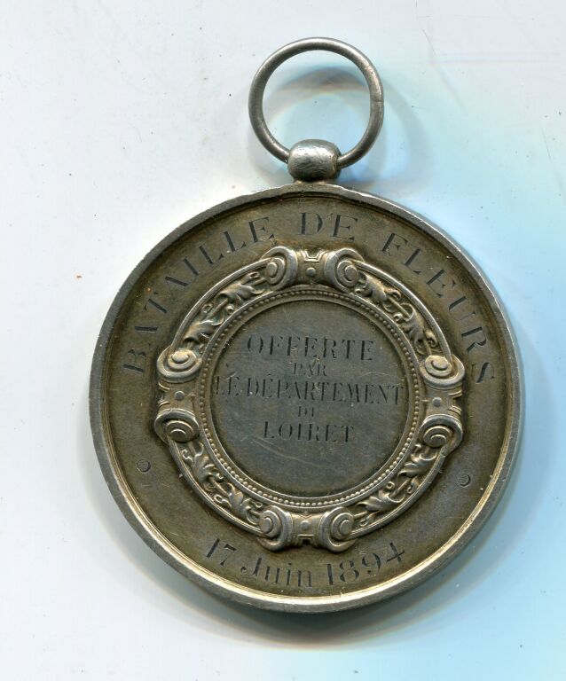 VERMEIL - 17 JUIN 1894, BATAILLE de FLEURS / SOCIETE AMICALE des VOYAGEURS D'ORLEANS et du LOIRET " - Rare grande médaille en argent doré " offerte par le département du Loiret ", avec bélière 47 mm - en pourtour attribution, en centre, souligné d'une chainette décorative, somptueux bouquet de fleurs dans une corbeille -