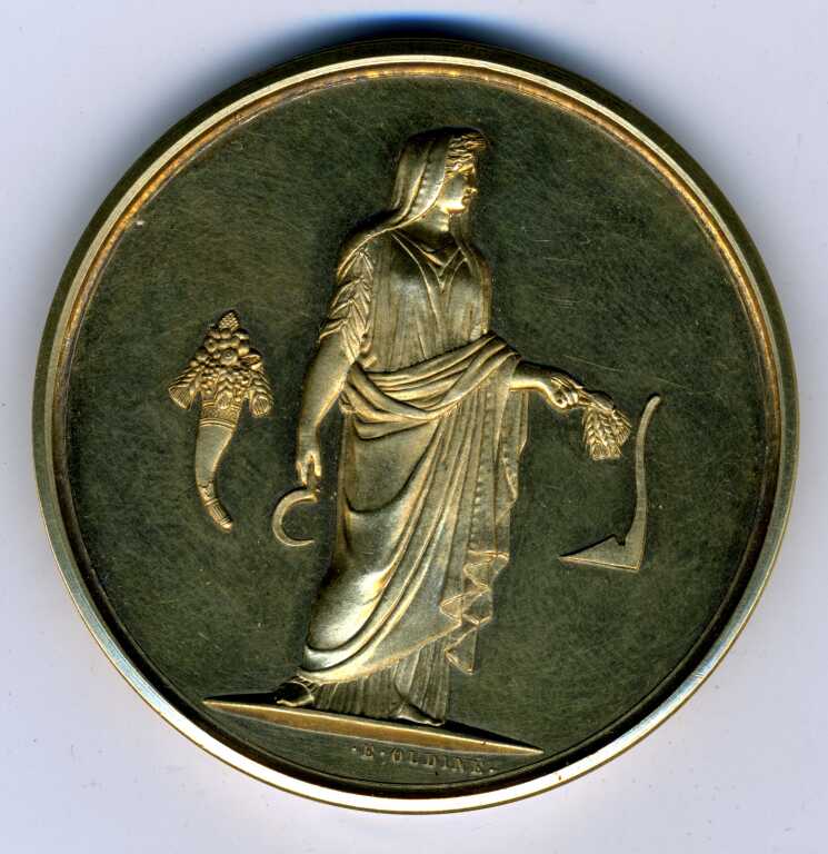 VERMEIL - COMICE AGRICOLE de JONZAC / CHARENTE INFERIEURE - Grande médaille classe or en argent doré, 50 mm - Femme vêtue à l'antique tenant serpe épis de blé, symbole de l'agriculture ; dans le champ corne d'abondance remplie de fruits et épis de blé à gauche, soc de charrue à droite - Gravure haut relief signée d'Eugène André OUDINE. - Revers : titre autour d'une couronne haut relief de fleurs, fruits, épis, têtes de bœuf, cheval, mouton, cochon, charrue et caducée. - sur la tranche poinçons argent et abeille.
