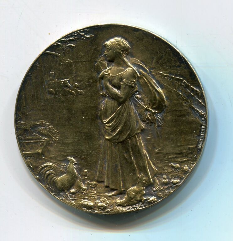 VERMEIL - " COMICE AGRICOLE de L'ARRONDISSEMENT D' ORLEANS " grande médaille de récompense classe or en argent doré 50 mm - intérieur de ferme avec basse-cour, au 1er plan femme debout portant un baluchon - Revers : couronne de végétaux et têtes de bœuf, cheval, mouton + charrue ; centre attribué à : A.GRISON 1895. - sur la tranche poinçons argent et corne - 61,33 grammes - L/A n° 1141 - Bescher ed - TTB