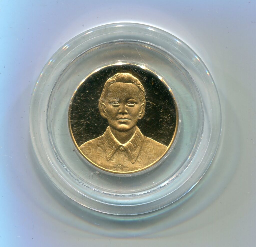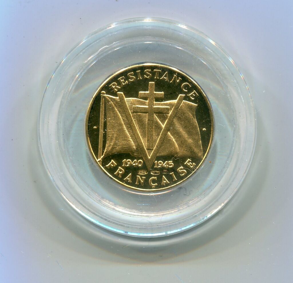 VERMEIL - HOMMAGE à la RESISTANCE FRANCAISE 1940 /1945 - Petite médaille en argent plaqué OR - drapeau français, croix de Lorraine et V de la victoire au-dessus - Revers : femme de face en tenue de déportée - Fleur de coin belle épreuve sous capsule.