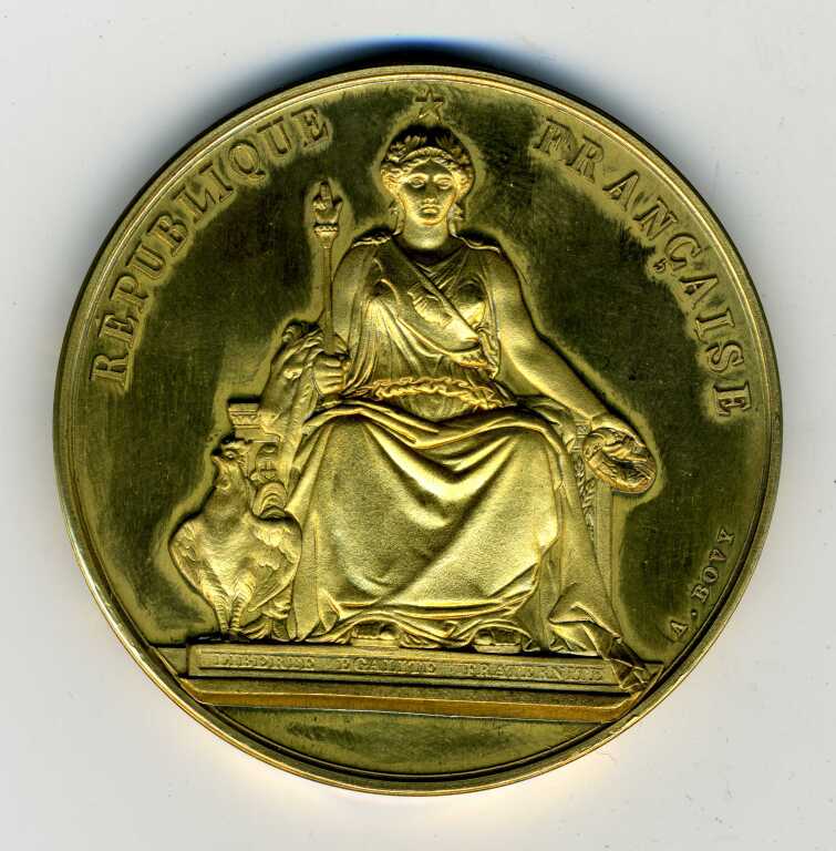 VERMEIL - " SOCIETE AGRICOLE ET INDUSTRIELLE LOUDUNOISE " grande médaille classe OR en argent doré - " REPUBLIQUE FRANCAISE " magnifique haut relief, La République assise de face, tête laurée étoile en dessus, tient main de justice de la main gauche et couronne de laurier de la droite ; à sa gauche coq gaulois debout. Posée sur un socle mention "Liberté-Egalite-Fraternité", œuvre signée A. BOVY.-