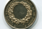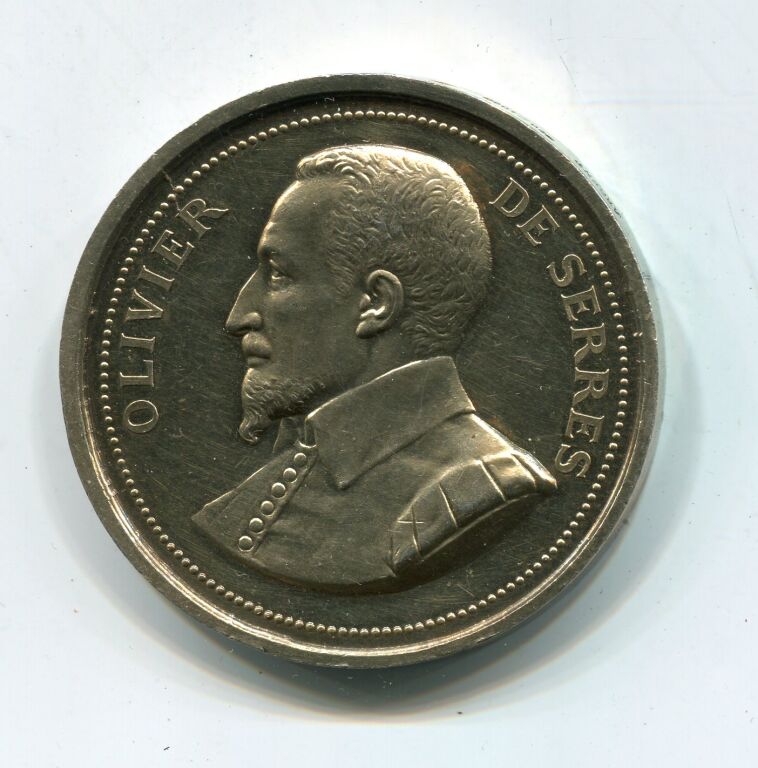 VERMEIL - " SOCIETE D'HORTICULTURE D'ORLEANS et du LOIRET ", Grande médaille classe or en argent doré 950 millièmes, couronne de fruits, fleurs et céréales, centre pour attribution.- " OLIVIER DE SERRES " épais listel, cercle de grenetis, en centre son portrait haut relief profil à gauche - sur la tranche poinçons argent 950 et tête de Minerve.