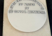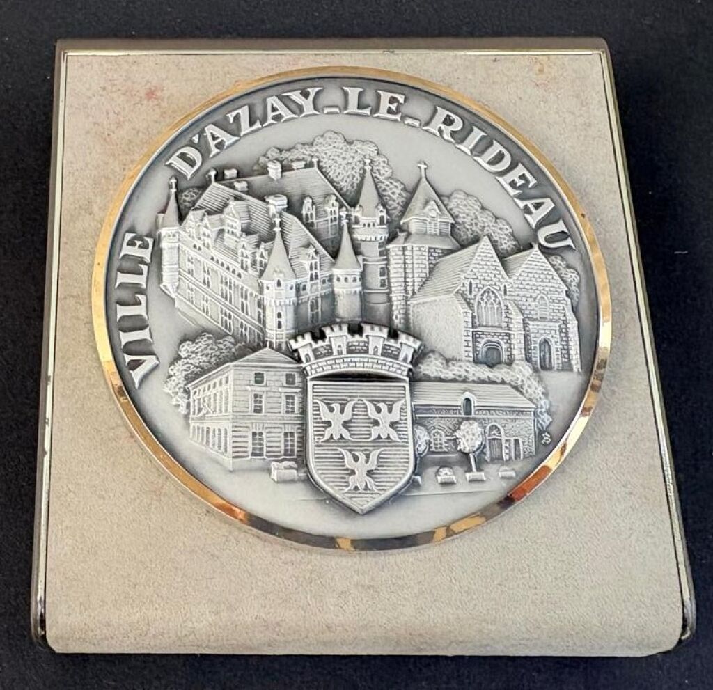 " VILLE D'AZAY le RIDEAU ", Médaille d'honneur de la ville -Très œuvre du médailleur Balme, divers attraits de la ville, vues en relief de l'hôtel de ville, le château, l'église, l'ensemble avec blason de ville couronné - En bronze patiné, le listel doré à l'or - Au revers, pour attribution, légende : "avec les compliments du maire et du conseil municipal '.