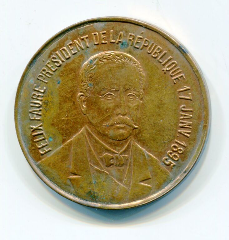 VILLE de MARSEILLE, SOUVENIR du VOYAGE du Président de la République FELIX FAURE le 17 janvier 1895 - Médaille / grand Jeton Laiton fourré 38 mm - légende et buste de face du président, au revers texte souvenir entre 2 palmes - 5,53 GRAMMES; ttb