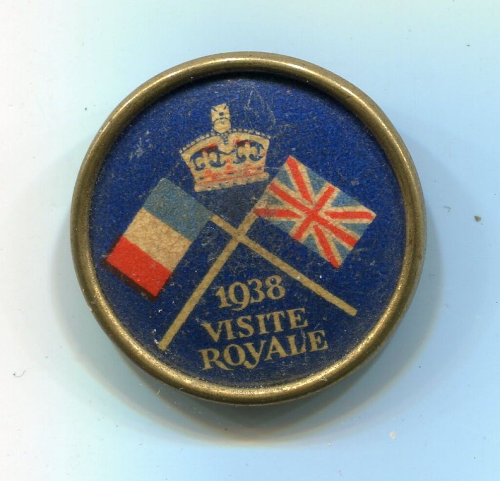 19 juillet 1938 - Badge commémoratif de la VISITE des SOUVERAINS BRITANNIQUES en FRANCE ( * ) - Badge de veston à épinglette, rond 24 mm. Dans un cercle laiton fond bleu avec drapeaux de France et Grande bretagne, hampes croisées, surmontées de la couronne britannique. A l'exergue entre les hampes " 1938 VISITE ROYALE ".