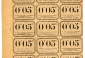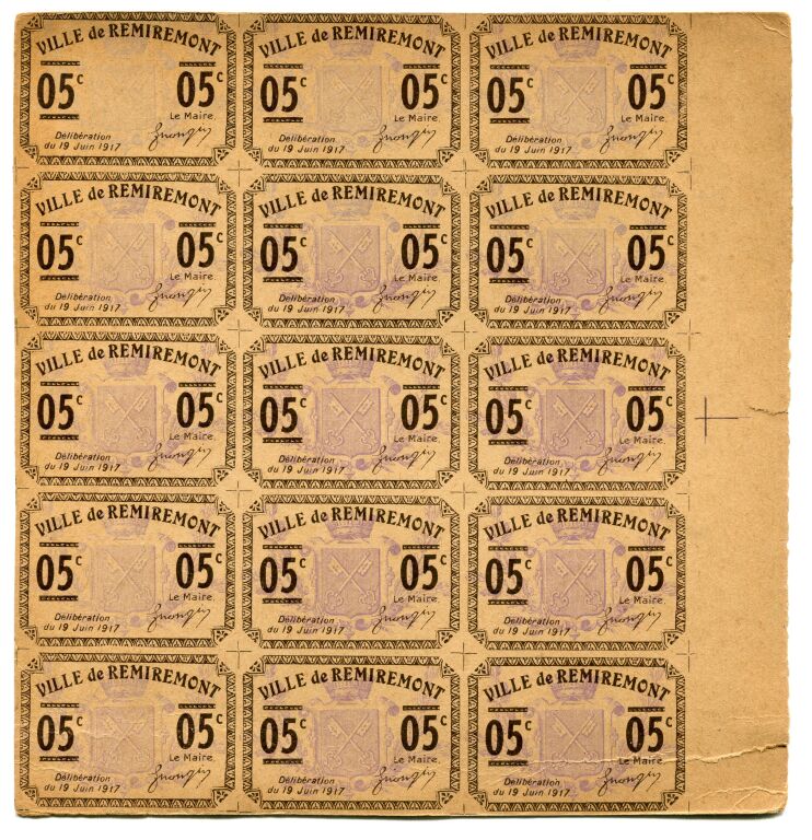 1ère Guerre Mondiale - VILLE de REMIREMONT / Vosges - 5c sur carton BILLET de NECESSITE, délibération du 19 juin 1917 - RARE BLOC de QUINZE billets non découpés, bord de feuille d'impression. Neufs, petit défaut, petit pli bas gauche.