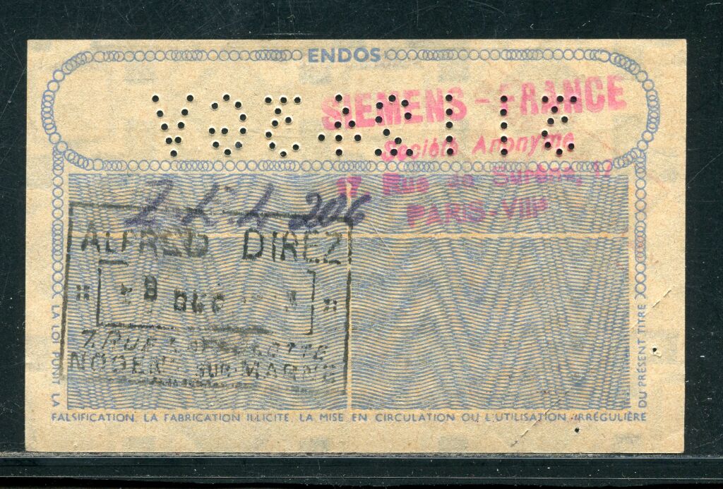 " BILLET de CINQ KILOS de produits sidérurgique en ACIER ORDINAIRE, numéroté en noir, valable jusqu'au 31 décembre 1943 - Utilisé, cachet SIEMENS FRANCE au dos.