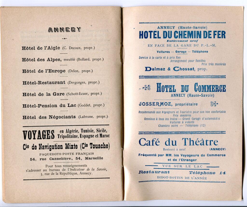 Descriptifs et plans des trajets, renseignements pratiques : le tour du lac en bateau à vapeur, promenade dans la vallée de Thônes en tramway à vapeur, les hôtels à Annecy (7 hôtels seulement...), les environs, un programme pour 8 jours à Annecy. Descriptifs des curiosités, les routes alentours, publicités...