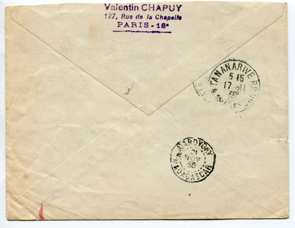 au départ de Paris 58 7 novembre 1935 - au dos arrivée à Tananarive RP 17 novembre.