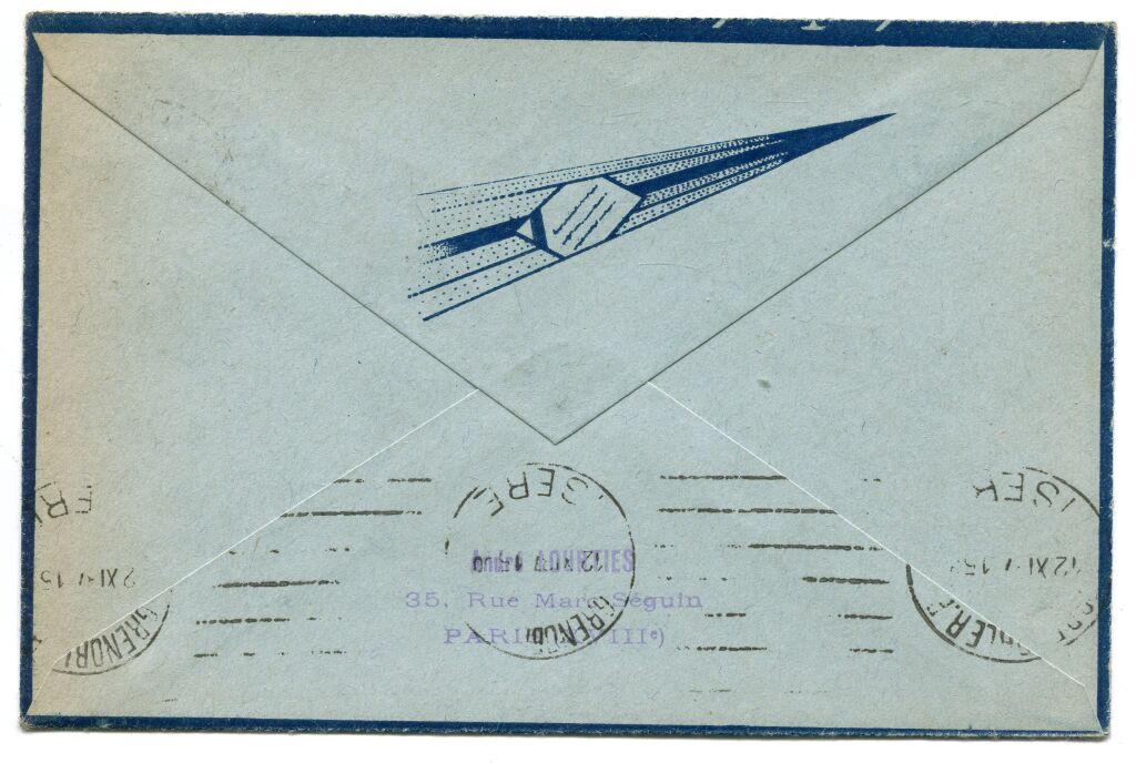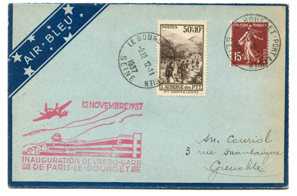 Affranchissement 50c auberge des PTT + 15c semeuse brun, cachet à date type horoplan LE BOURGET PORT AERIEN 12 novembre 1937 + GRANDE GRIFFE COMMEMORATIVE de l'inauguration, frappe en rouge 36 x 62 mm - au dos arrivée Grenoble, flamme en continu lignes, même jour. - sur enveloppe de la Cie AIR BLEU.