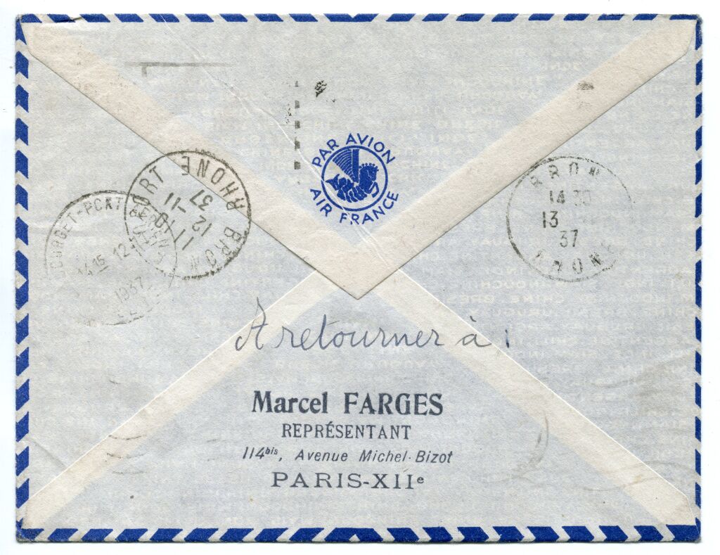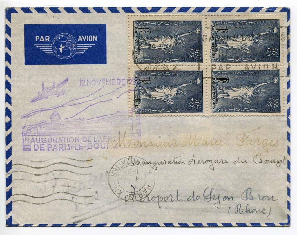 Affranchissement bloc de 4 Liberté aide aux réfugiés, cachet à date Paris XII Crozatier + CAD Horoplan (au dos) Le Bourget Port Aérien 12 - 11 +GRANDE GRIFFE COMMEMORATIVE de l'inauguration, frappe en violet 36 x 62 mm - au dos arrivée Lyon BRON AEROPORT, même jour. - sur enveloppe de la Cie AIR FRANCE.