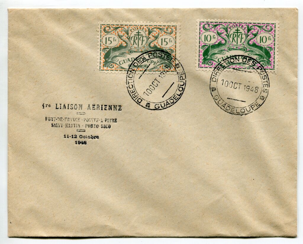 Au départ de Pointe à Pitre, affranchissement 10 F + 15 F série France Libre (De Londres), oblitération particulière de la " Direction des Postes de Guadeloupe " 10 oct 1948.