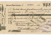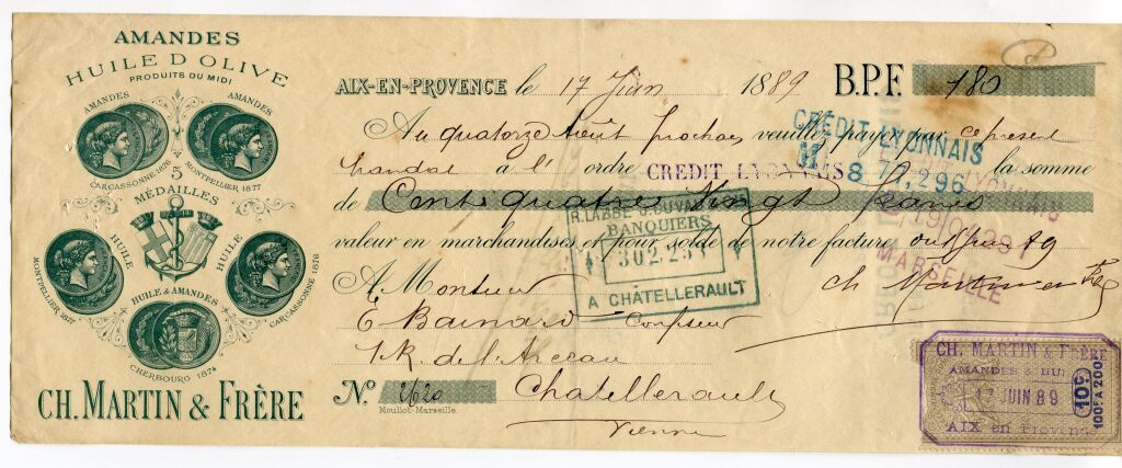 - 1889, bien illustrée, Ets CH. MARTIN et FRERE, AMANDES, HUILE D'OLIVES, produits du Midi. Au centre ancre de marine et blasons de Marseille et Aix. Médailles obtenues à Carcassonne 1876, Montpellier 1877 pour les amandes. Montpellier 1877 & Carcassonne 1878 pour l'Huile - pour les 2 Cherbourg 1874. Fiscalité timbre mobile groupe allégorique.