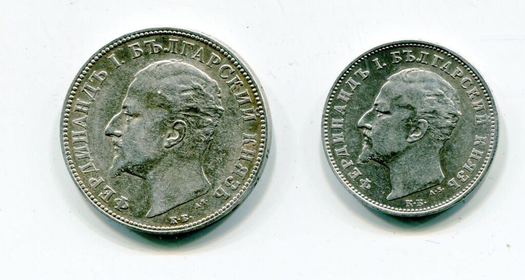 ARGENT - BULGARIE / UNION LATINE - FERDINAND 1er PRINCE sous la souveraineté turque - Deux monnaies à son effigie, profil à gauche : un Lev 1894 KB (atelier de Kormoczbanya) TTB/SUP + 2 Leva 1894 KB SUP.