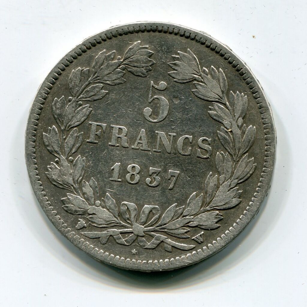 ARGENT - FRANCE - CINQ FRANCS LOUIS PHILIPPE TETE LAUREE (G 678) à la taille de l'écu - 24,95 grammes - 1837 W (atelier de Lille ) - TTB