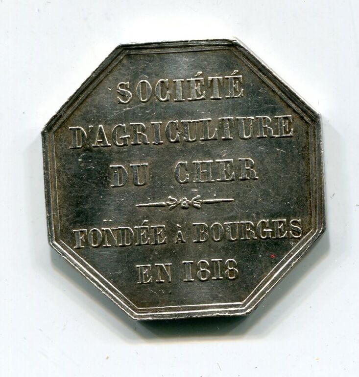 ARGENT - JETON de la " SOCIETE D' AGRICULTURE du CHER " fondée à BOURGES en 1818 - octogonal 27,5 mm - Charrue et instruments agricole (faucille, bêche, fléau, faux…) posés sur gerbe de blé, gravure signée - SUP 8,54 grammes.
