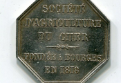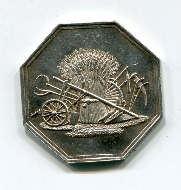 ARGENT - JETON de la " SOCIETE D' AGRICULTURE du CHER " ( * ) - fondée à BOURGES en 1818 - octogonal 27,5 mm - Charrue et instruments agricole (faucille, bêche, fléau, faux…) posés sur gerbe de blé, gravure signée - SUP 8 grammes.