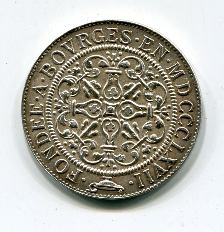 ARGENT - JETON de la SOCIETE des ANTIQVAIRES du CENTRE ( * ) - armoiries de la ville de Bourges (d'azur à 3 moutons d'argent accornés...) entourées des inscriptions, croix à midi - Revers : FONDEE A BOVRGES EN MDCCCLXVII (1867), décor en centre sur 2 axes d'arabesques et feuilles, coupe antique à midi.
