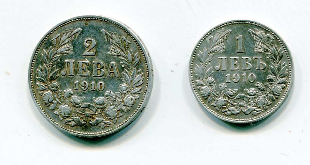 Deux monnaies à l'effigie du Roi, profil à droite, œuvre du sculpteur-médailleur autrichien Stephan SCHWARTES : 1 Lev 1910 + 2 Leva 1910 - Les deux SUP