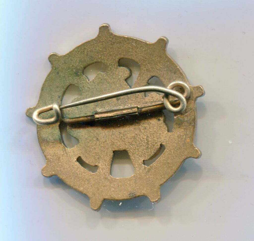 Rond 30 mm, émail grand feu en forme de roue émail vert à écritures dorées. En centre, sur les rayons dorés, ancêtre automobile portant drapeau émail bleu et rouge de la ville de Clermont Fd ; sur le châssis de l'auto millésime 1900. Épinglette au dos.