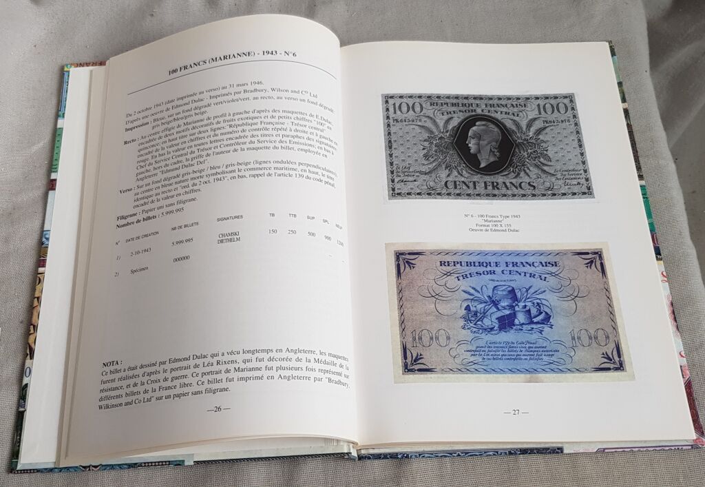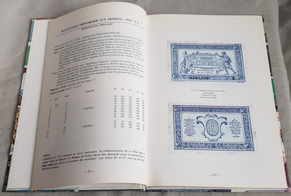 répertoire et cotation suivant 5 états de conservation, avec photo couleur recto et verso, de tous les billets du Trésor. Un ouvrage qui fait la lumière sur un sujet couvert par le secret militaire et pour lequel les archives manquent souvent. - 25 x 17 cm.