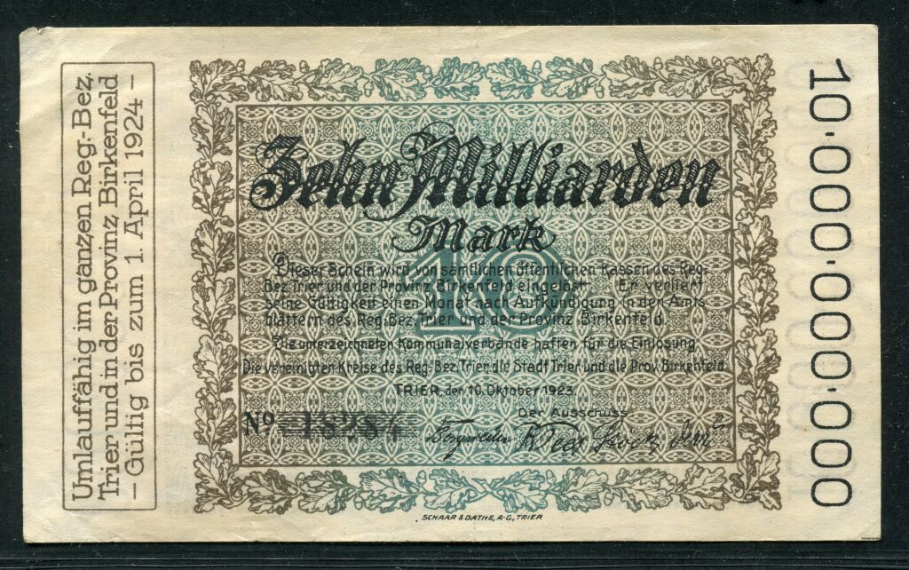 BILLET - ALLEMAGNE INFLATION - DIX MILLIARD de MARK - Emission municipale de la ville de TRIER (Trèves) du 10 octobre 1923 " valable dans la ville et dans la province de Birkenfeld jusqu'au 1er avril 1924 ".