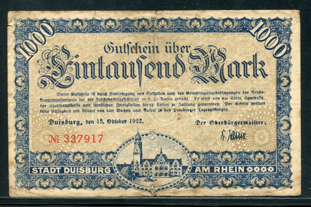 BILLET - ALLEMAGNE INFLATION - MILLE MARK - Émission de la Caisse d' Épargne municipale de la ville de DUISBOURG sur le Rhin du 15 octobre 1922 - illustration de l'hôtel de ville de la ville et ,au dos, d'un bateau remorqueur à vapeur et à aubes sur le Rhin.