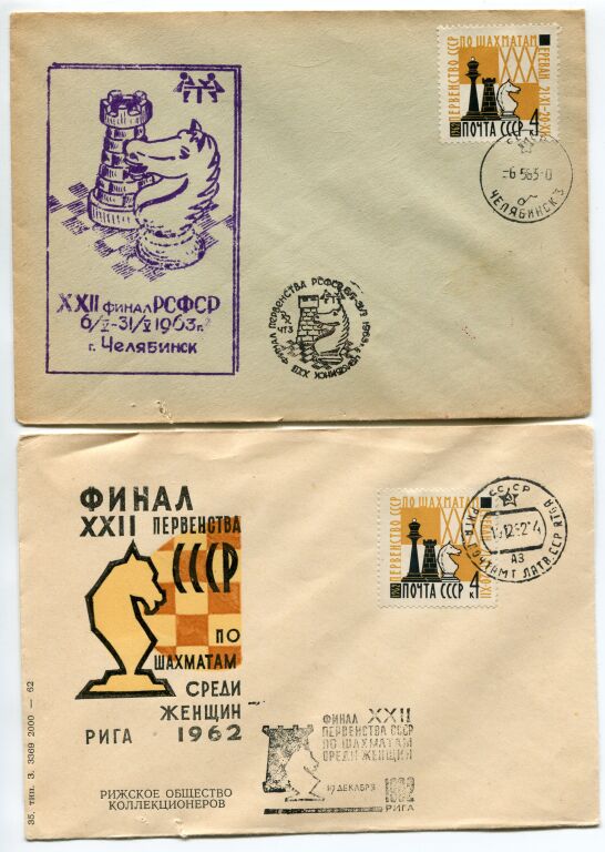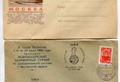 - 6 mai 1963 - Finale du championnat à Tchliabinsk. Oblitération commémorative du tournoi, affranchissement timbre spécial n° 2602 émis pour le 30e tournoi à Erevan.