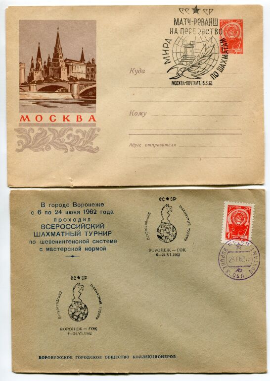 - 23 juin 1962 - Tournoi d'échecs pan russe à Voronej - Timbre d'usage courant armoiries & cachet commémoratif illustré du tournoi sur enveloppe à entête de l'organisation.