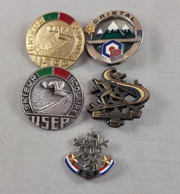 CINQ INSIGNES SKI années 60 / 70, broches à épinglette :