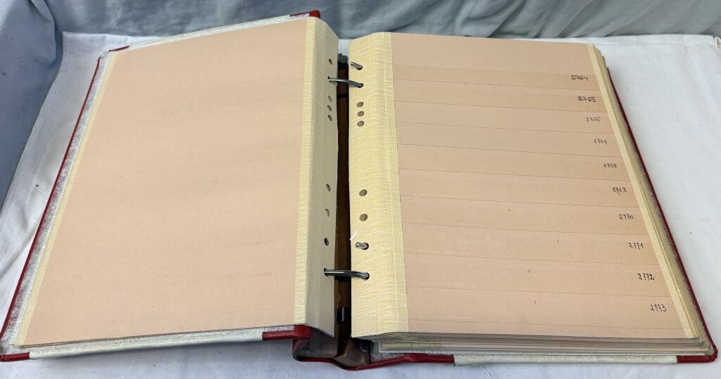CLASSEUR de STOCK PROFESSIONNEL - Très forte reliure mobile, forte couverture recouverte péga, dos bois fabrication T.I.M. avec système ouverture à plat, 2 anneaux décalés (2 x 2), débrayable. Contient 37 (trente sept) feuilles de stock en solide carton bulle, dix bandes, pour classement pro pouvant supporter des épaisseurs.
