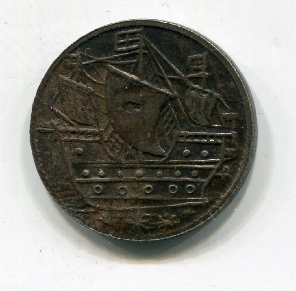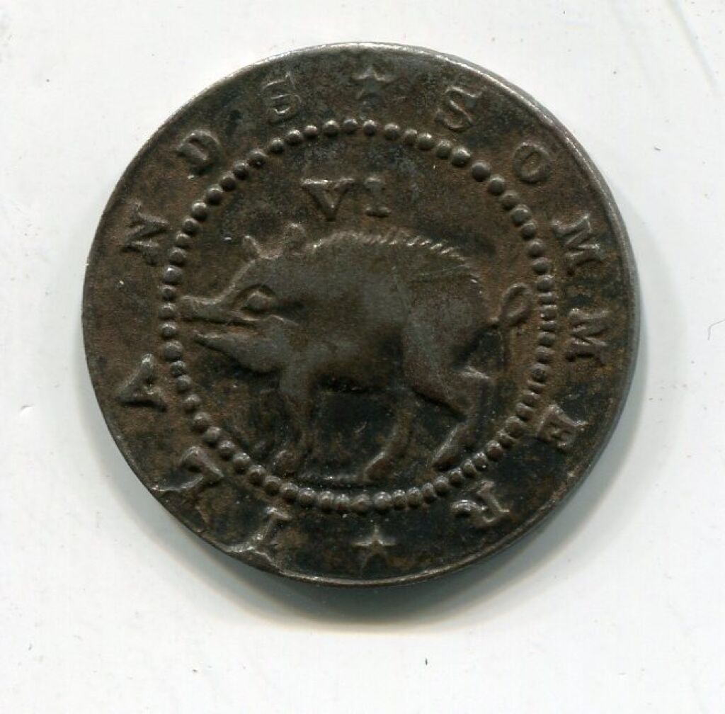 COMPAGNIE des BERMUDES 17e siècle / Territoire Britannique - Jeton / Monnaie de six pences des ILES SOMMER (* ) -Cochon sauvage debout de profil légende circulaire "Sommer Island - Revers : grand voilier de commerce - Cuivre argenté - 3,24 grammes."-TTB