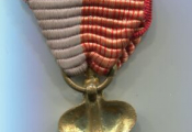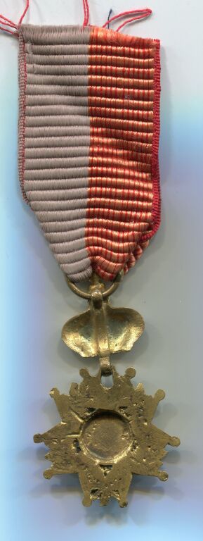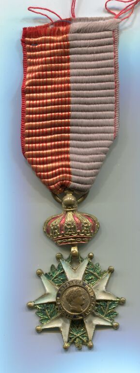 CROIX D' HONNEUR ou MERITE SCOLAIRE - médaille pendante hauteur 13 cm .En forme de légion d'honneur Empire, médaillon colorisé blanc & vert avec Napoléon 1er tête laurée en centre. La bélière mobile est en forme de couronne colorisée rouge. Fabrication artisanale laiton, ruban partagé jaune filets rouges et gris.