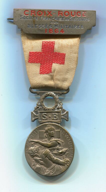GUERRE de 1870 - 1871 - Médaillon ovale 48 x 25 mm avec bélière mention S.B., allégorie de la France portant secours à un cuirassé blessé mention " Patrie Dévouement " - au dos texte : " Société Française de Secours aux blessés militaires 1864-1866". Ruban blanc avec, brodée, grosse croix rouge en centre. Agrafe sur le ruban avec texte en rouge et gris : "CROIX ROUGE société française de secours aux blessés militaires 1864 ".