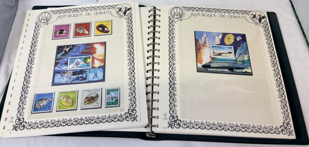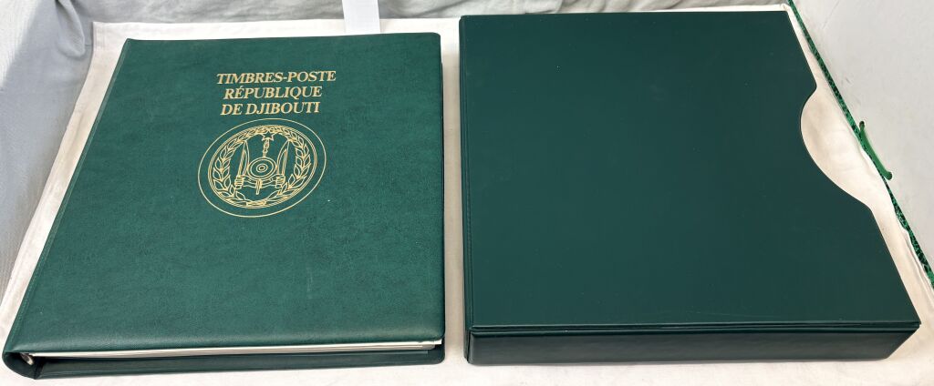 DJIBOUTI ( République de …) - Très belle collection des années 1978 à 1986, Poste + poste aérienne + feuillets. Timbres neufs ** sous reliure Lindner 18 anneaux + boitier sur 53 feuilles bristol chamois d'album pré-imprimé du système T Lindner (timbres sous feuilles / pochettes transparentes pour un classement sans charnière).