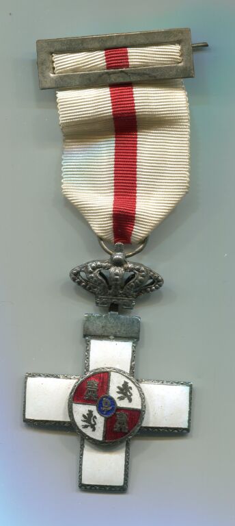 Modèle monoface, médaillon émail grand feu 60 x 40 mm ; croix grecque à branches surmontée d'une couronne argent sur lesquelles figure en centre une pastille rajoutée en émail rouge et blanc, filets argent, le blason d'Espagne. -