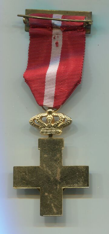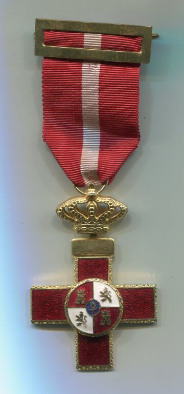 ESPAGNE - CROIX de L' ORDRE du MERITE MILITAIRE ROUGE ( RIOJA CRUZ ) de Première classe pour MERITE de GUERRE - Modèle monoface, émail grand feu 60 x 42 mm ; croix grecque à branches surmontées d'une couronne dorée sur lesquelles figure en centre une pastille rajoutée en émail rouge et blanc, filets or, le blason d'Espagne.