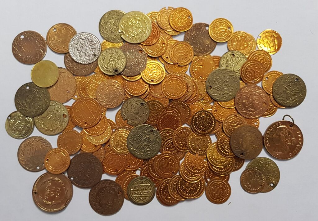 150 reproductions ou imitations de monnaies en laiton doré / argenté / bronzé, pour servir en bijouterie ou enrichir les tenues et parures, costumes de mariées traditionnels.