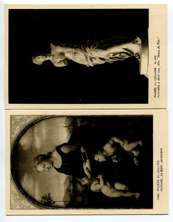 FRANCE 1937 - Paire VICTOIRE de SAMOTHRACE, n° 354 et 355. Chacun des timbres collé sur une carte postale des Musées Nationaux / Musée du Louvre (comme vendus à l'époque) formant carte maximum ( vues : Raphaël la Belle Jardinière + Vénus de Milo, Aphrodite à demi nue). - Timbres neufs