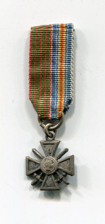 FRANCE 1ère Guerre Mondiale - RARE CROIX de GUERRE MINIATURE UNIFACE AVEC RUBAN MIXTE moitié croix de guerre / moitié médaille des blessés militaires.