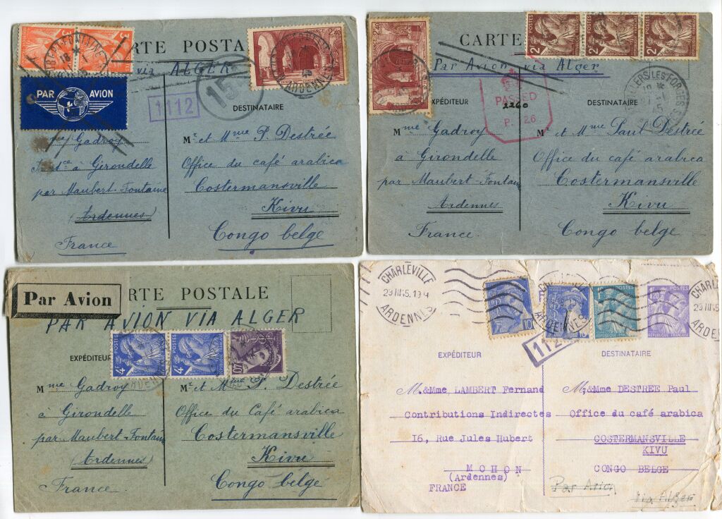 - COLLECTION de QUATRE BEAUX DOCUMENTS - 4 cartes expédiées au même destinataire (1 entier 1 F 50 Iris + 3 cartes correspondances inter zones) au départ des Ardennes pour KIVU au Congo Belge - intéressantes correspondances du temps (1945). Affranchissements par divers timbres mobiles (photos), marques de Censure françaises et anglaises.