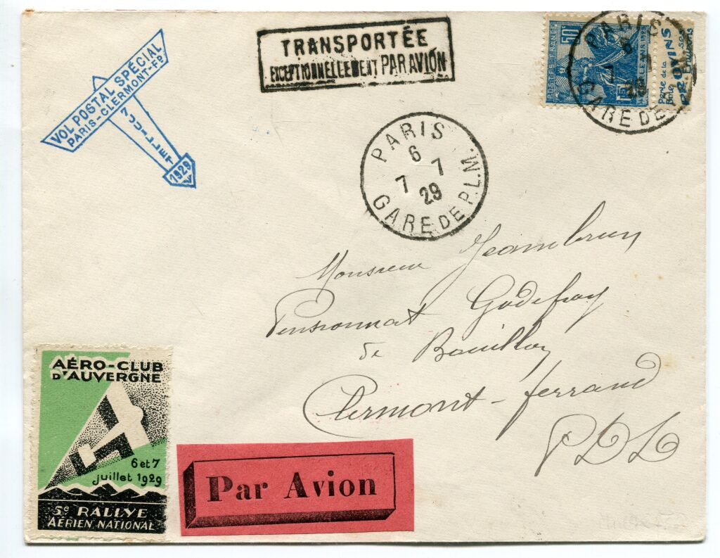FRANCE - AEROPHILATELIE - ERINNOPHILIE - 6 & 7 juillet 1929, 5e Rallye Aérien de l' AERO-CLUB D' AUVERGNE, VOL POSTAL SPECIAL PARIS - AULNAT - CLERMOND FERRAND - Lettre au départ de Paris Gare P.L.M. 7 juillet 1929 + étiquette rouge par avion + griffe spéciale du vol en forme d'avion, frappe en bleu + griffe "transportée exceptionnellement par avion. PORTE VIGNETTE de propagande du 5e Rallye aérien. Affranchissement timbre Jeanne d'ARC avec vignette publicitaire " PROVINS perle de la Brie " ( 257 pub 19 ).